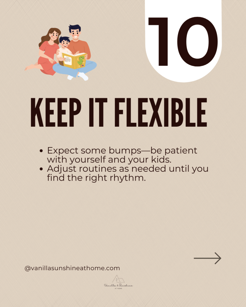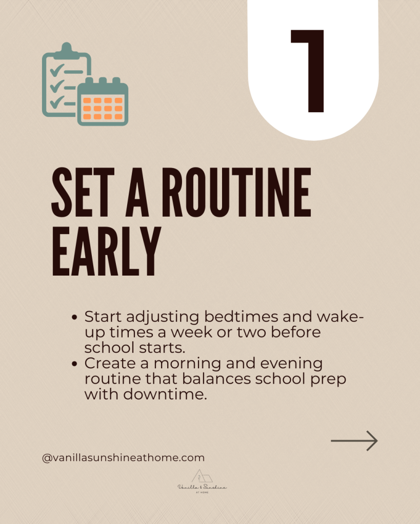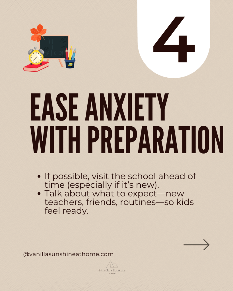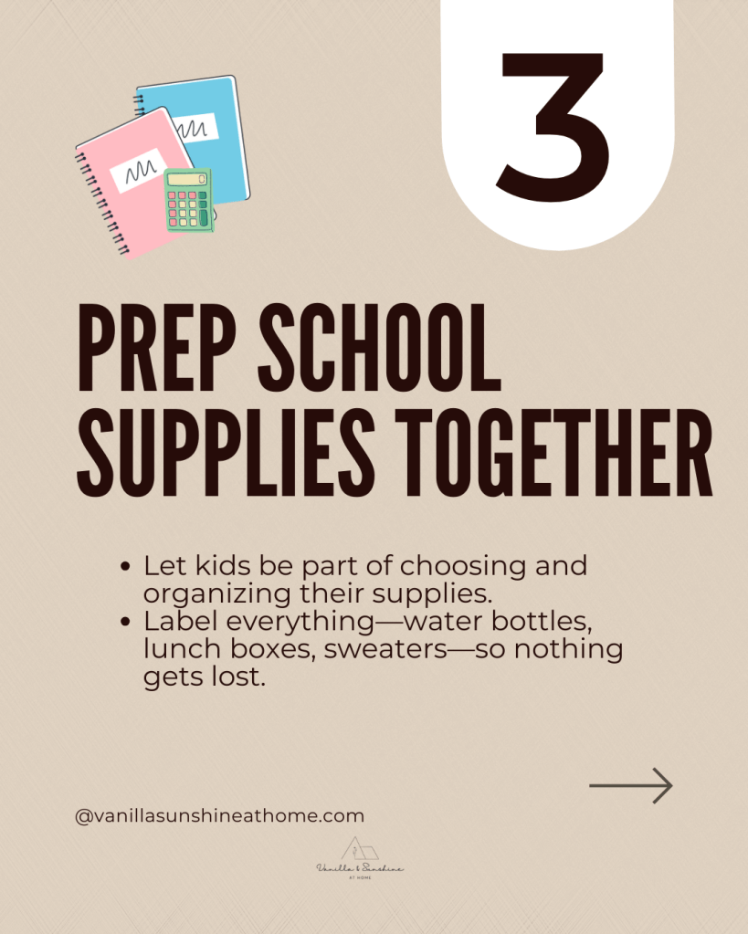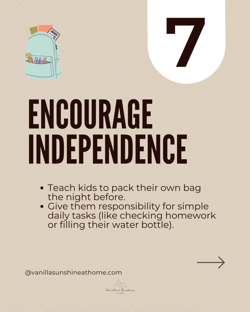 Encourage kids to pack their bags and set out their shoes the night before. A few minutes of preparation can make mornings calmer and give everyone a smoother start to the day.