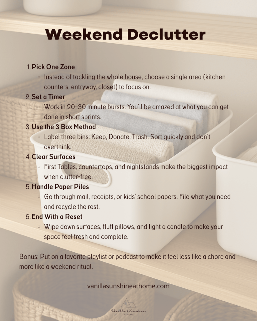 ✨ Bonus Tip: Put on your favorite playlist or podcast while you declutter—it makes the process more enjoyable and turns it into a weekend ritual.
